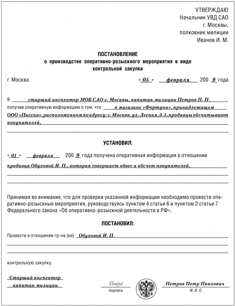 Как только контрольная закупка объявлена, оперативники обязаны предъявить вам свои служебные удостоверения и постановление о проведении закупки. Его утверждает начальник сотрудников полиции, пришедших с проверкой. В постановлении должно быть указано, в связи с чем и у кого проводится закупка.