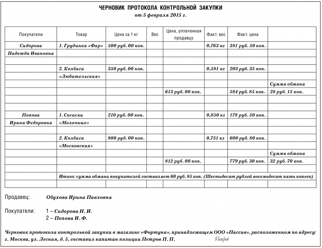 Результаты проверочной закупки сотрудники милиции отражают в протоколе контрольной закупки. Примеры черновика и протокола контрольной закупки при- ведены на следующих страницах.Ответственность по итогам проверочной закупки